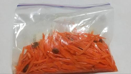 切った人参、水で戻したレーズン、フレンチドレッシングを保存バッグに入れる。手で数回揉む。急いで食べたい場合は、沢山揉みこむとよいだろう。10分程度冷蔵庫で放置する。しっかり冷やすと美味しさ増すので、ほかの献立メニューを作る前に、あらかじめ作っておくことができればベター。
