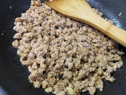 フライパンにごま油、にんにく、生姜を熱し、香りがたったら中火で豚ひき肉を炒める。全体に火が通ったら、豆板醤、甜麺醤を加える。全体に馴染んだら火を止める。