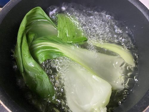 鍋にお湯を沸かし、もやしを茹でてザルにあげて水気をきる。また、ひとつまみの塩を入れて青梗菜を茹でる。流水で冷やし、水気をぎゅっと絞る。