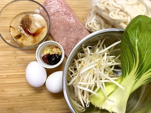 お皿にうどんを入れ、スープをそそぐ。肉味噌、青梗菜、もやし、卵をのせ、お好みでラー油をかける。