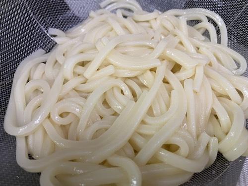 鍋にお湯を沸かし、表示の時間通りにうどんを茹でる。冷水で冷やし、ザルにあげて水気をきる。