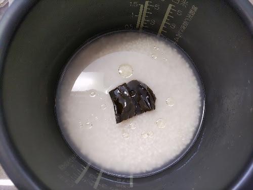 酒、昆布、米油、残りの塩も加えて炊飯器のスイッチを押す。