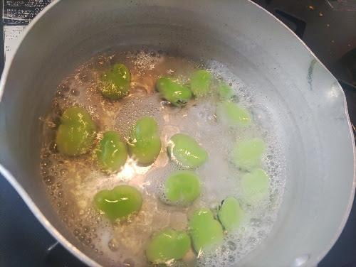 そこに、そら豆を投入して1~2分茹でる。茹で上がったら、豆を小皿に移して冷ます。