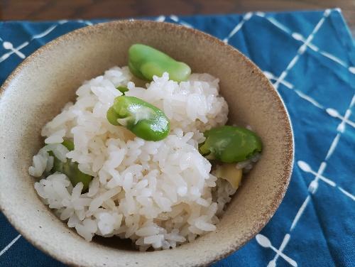 炊きあがったら昆布を取り出し、そら豆を加えてさっくり混ぜ合わせて完成。