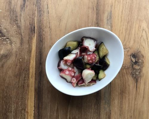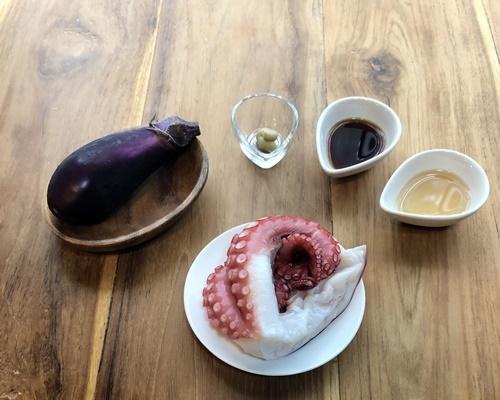 わさび、ポン酢、白だしを混ぜ合わせ、タコ、茄子と和える。