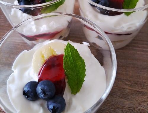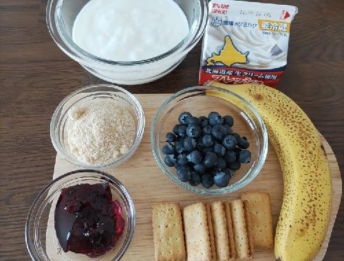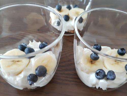 バナナは皮をむき、1口サイズにカットしておく。ブルーベリーはさっと水で洗い、キッチンペーパーなどで優しく水気をふきとる。ビスケットはグラスに入るように大きさを調整しておく。●の2つを合わせてホイップし、六分立てにしておく。〇の2つも合わせて軽く混ぜておく。