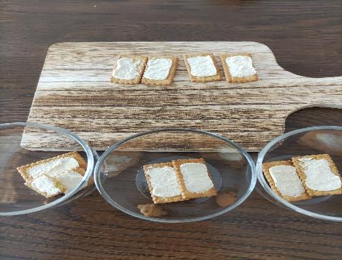 器にビスケットを敷く。ビスケットの種類によっては塩気、クリーム付きなどがあるが、味のアクセントになるのでそのまま使用する。