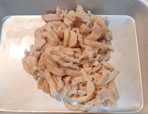 Step.3 鶏皮を茹でて薄くスライスする