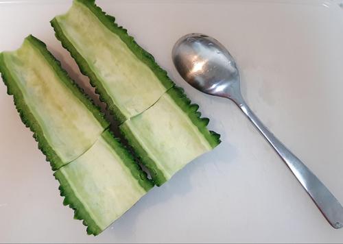 ゴーヤを半分に切って、スプーンでワタを取り除く。