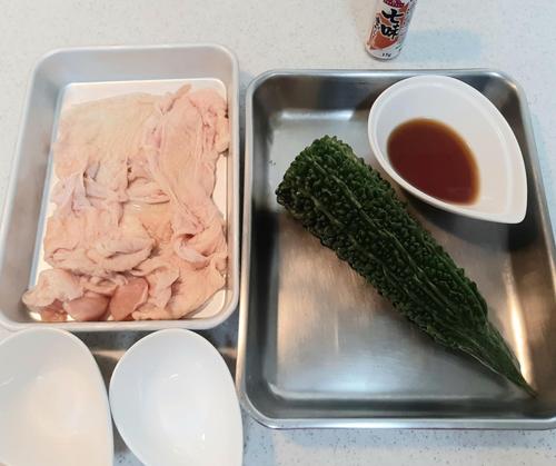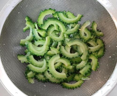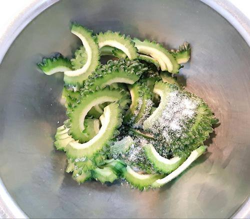 ゴーヤを2mm程度にスライスして、ボウルに塩・砂糖・スライスしたゴーヤを入れ、よく混ぜる。20分そのまま置いたら、出てきた水分を捨てる。このひと手間で苦みが和らぐ。