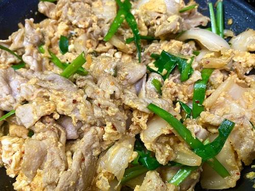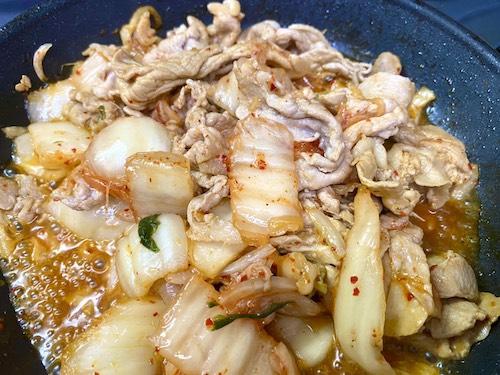 豚肉に火が通ったら、キムチ、鶏ガラスープの素を加えて全体になじむように中火で炒める。