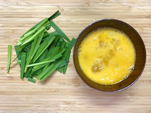 ニラは4?5cm幅に切る。卵は溶いておく。
