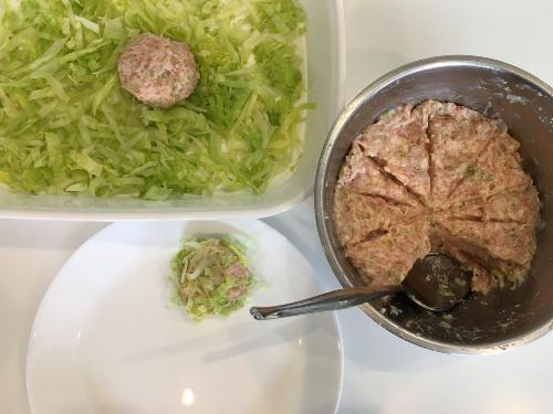 よくこねたタネを10等分にする。ハンバーグをこねる要領で成形する。形が整ったらバットのレタスの上にタネを置き、表面にレタスをまとわせる。