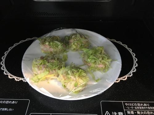 成形できたら、ラップをふわっとかけ、電子レンジ500Wで2分半加熱する。(電子レンジの種類により、加熱時間が異なる)