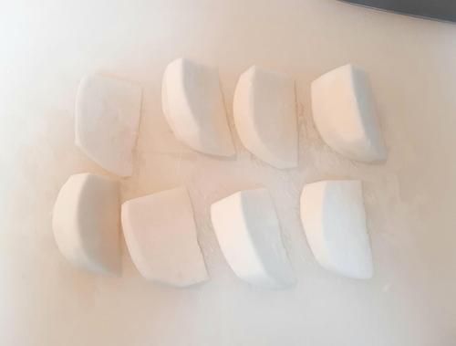 かぶの茎を切り落として、皮をむき、8等分のくし切りにする。大きい場合は10等分にする。