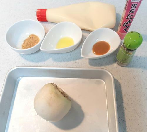 バーニャカウダ風ソースの材料をすべて混ぜ合わせる。かぶとソースをお皿に盛り付け、お好みで乾燥ローズマリーやイタリアンパセリをかけて完成。