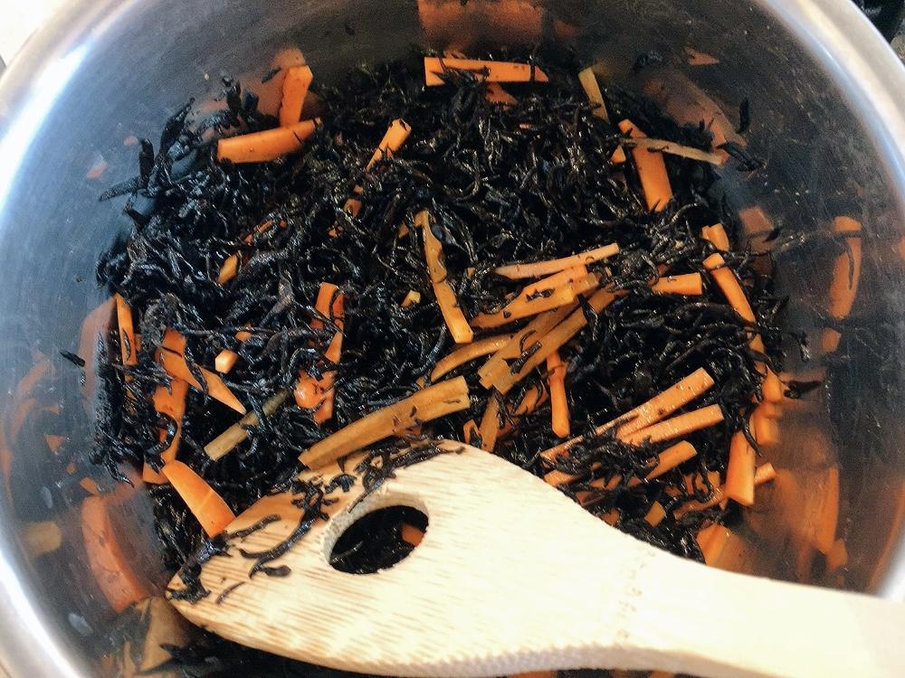 鍋にゴマ油を引いて、ひじきとにんじんを中火で炒める。
