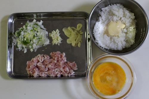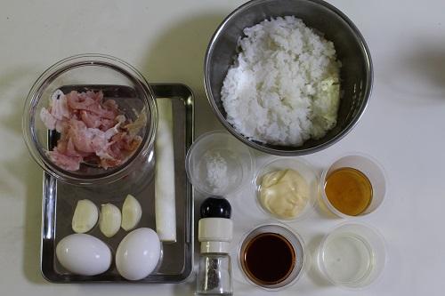 豚肉は2~3cm幅に切り、長ねぎはみじん切りする。にんにくは1片はみじん切り、残り2片は薄くスライスする。卵は溶きほぐす。ごはんにマヨネーズを混ぜておく。ごはんにマヨネーズを混ぜることでパラパラのチャーハンに仕上がる。