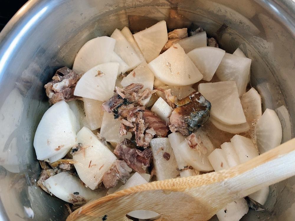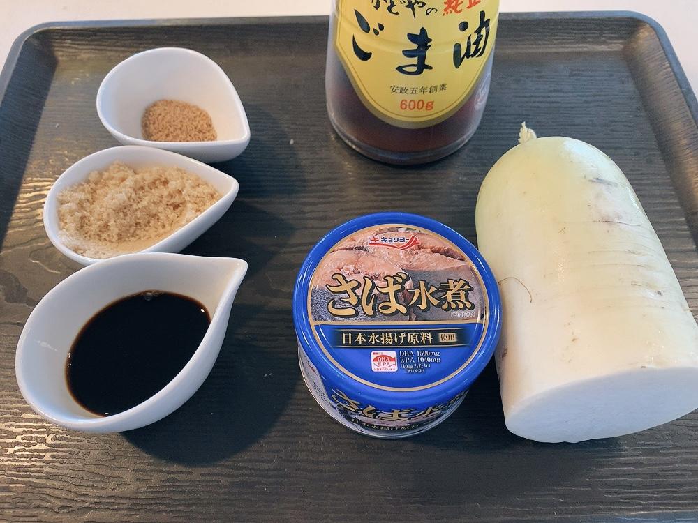 鍋にゴマ油を引いて、鯖缶と大根を入れて中火で軽く炒める。このときに、鯖缶の煮汁と大根の汁も一緒に入れておく。