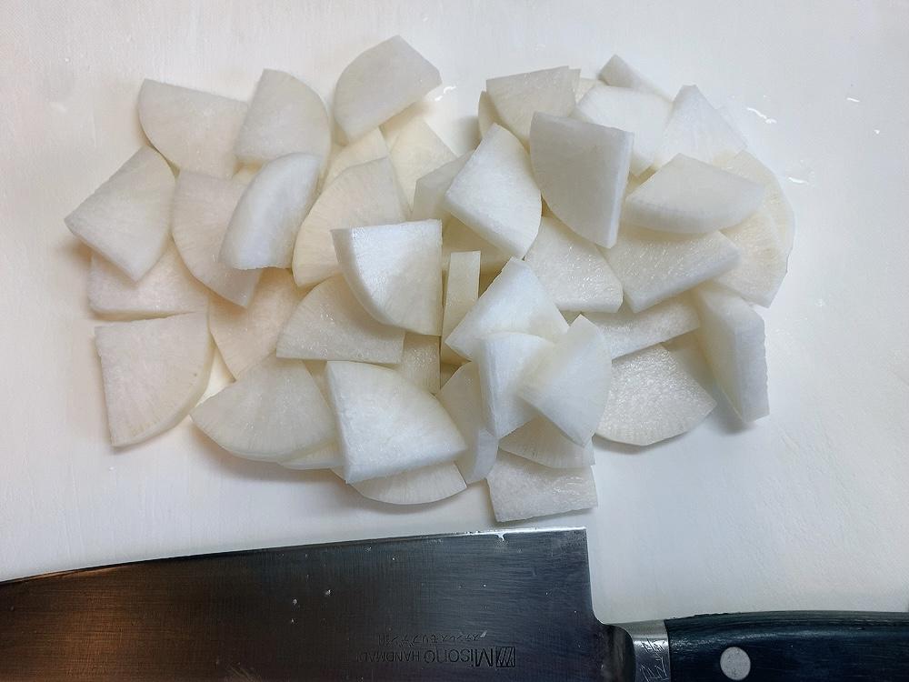 大根は皮を剥いて、厚さ1.5cm程度のいちょう切りにする。耐熱皿にのせてラップをかけて、レンジで600w2~3分程度加熱しておく。