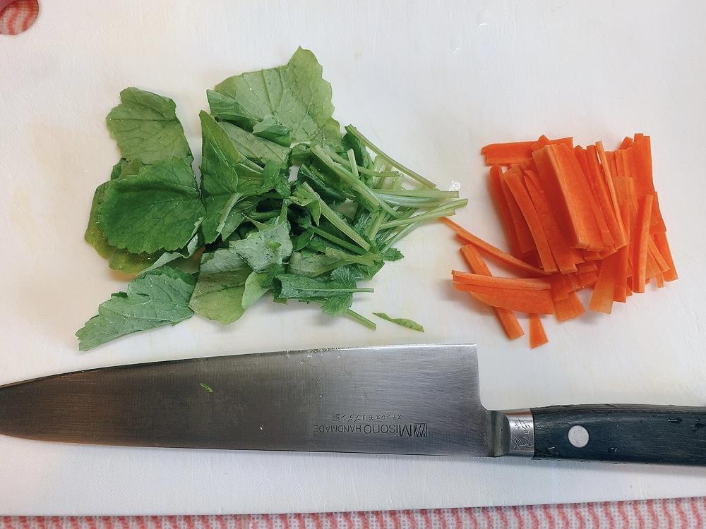 大きめの鍋やフライパンににんじんと水を入れて茹でて、沸騰したらラディッシュの葉ともやしを加えて1分程度茹でる。ザルなどにあげたら、しっかりと水切りをしておく。