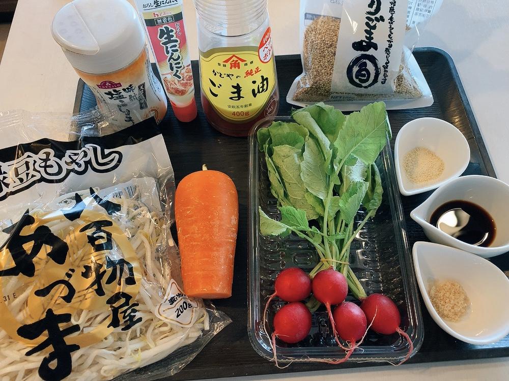 ラディッシュの葉、にんじん、もやしに、鶏ガラスープの素、醤油、ごま油、砂糖、塩コショウ、おろしにんにく、白ゴマを加えて、混ぜ合わせたら完成となる。