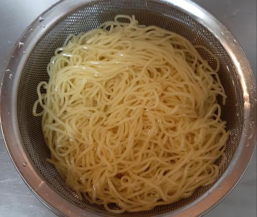 シンクにざるとボウルを用意して、茹で終わった麺を流水・氷水で冷やす。
