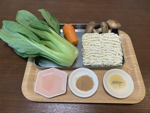 青梗菜は食べやすい大きさ、椎茸は薄切り、人参は千切りにする。