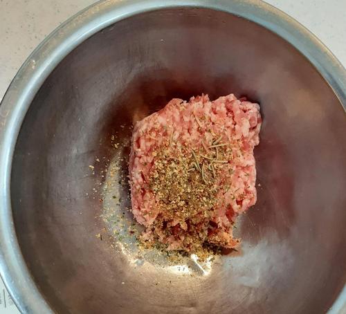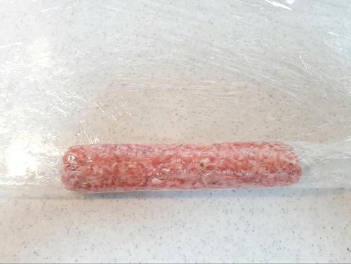 豚ひき肉が薄ピンク色になり、粘り気が出てきたら、ソーセージ状に成型する。