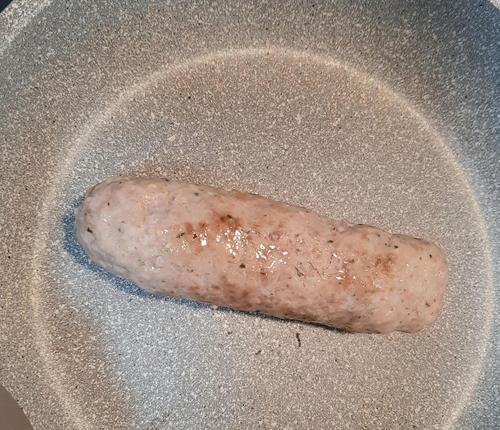 ラップから取り出し、強火のフライパンで表面に焼き色を付ける。お好みで粒マスタードを添えて盛り付けたら完成。