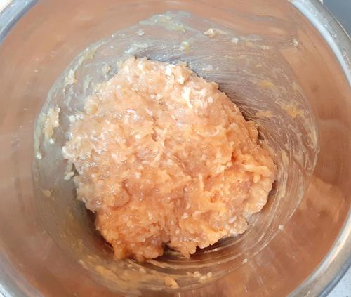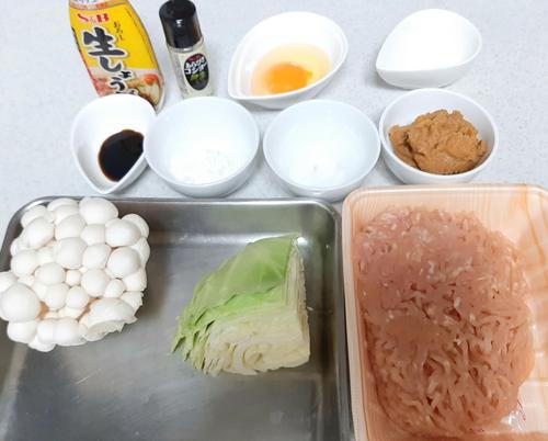 ボウルに鶏ひき肉、塩、胡椒を入れて粘り気が出るまでよく捏ねる。粘り気が出たらおろし生姜、料理酒、濃口醤油、卵を入れて混ぜ合わせ、最後に片栗粉を入れる。
