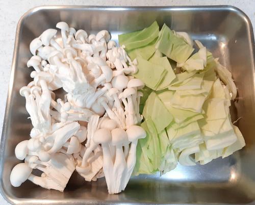 ブナシメジは軸をカットして、一口サイズに手で割く。キャベツは一辺4~5cmにカットする。