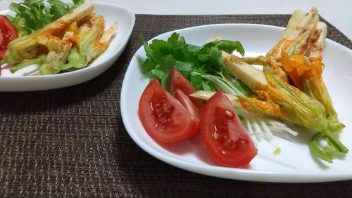 ズッキーニの花サラダ、トマト、セロリを半量ずつ盛り付けて完成。
