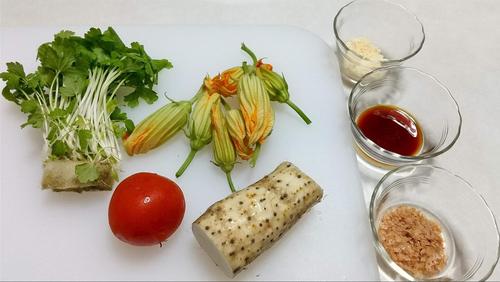 ズッキーニの花の水気をペーパーでよくふき取る。山芋は細切りにして、かつお節、チーズ、醤油と合わせ和える。トマトはくし切り、ミニセロリは洗ってばらす。