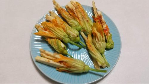 ズッキーニの花の中に調味料と和えた山芋を入れて、花弁を巻きつける。