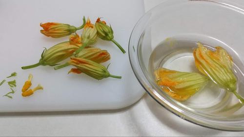 Step.2 材料を切り、ズッキーニの花の水気をペーパーでふき取る