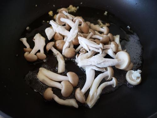 白ワインから泡が立ったら、しめじを入れて炒める。ここでも弱火のままにして、しめじの旨みをしっかり出そう。
