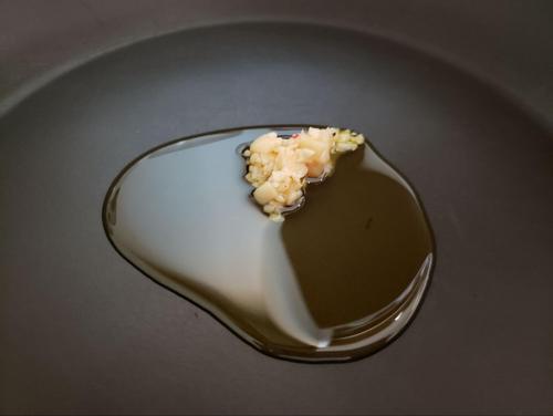 ニンニクの香りを立たせるために、フライパンにオリーブオイルとニンニクを入れてから火をつける。ニンニクから細かい泡が立ってきたら、弱火にして白ワインを入れる。