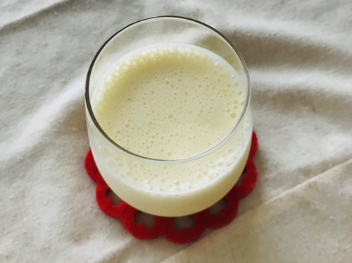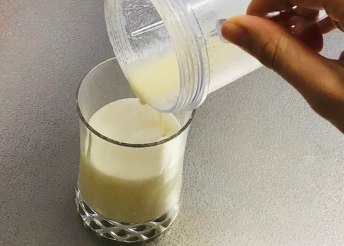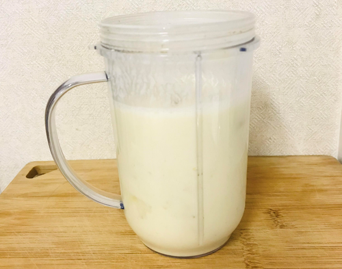 氷を加え滑らかになるまで混ぜる。味見をし、もし甘みが足りなければはちみつを小さじ1~加える。