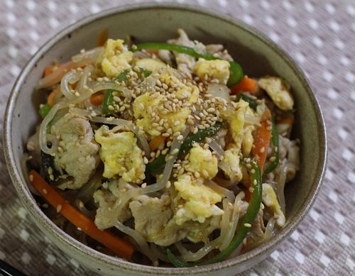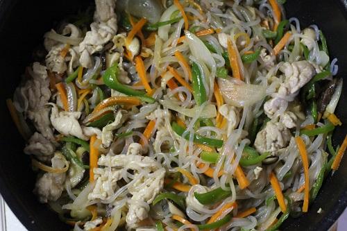フライパンにごま油を熱し、中火で野菜、豚肉を炒める。豚肉に火が通ったら、白滝を加える。全体をよく混ぜ、調味料を加える。水分をとばしながら強火で炒め、味がなじんだら、炒り卵を加える。全体をよく混ぜ合わせて火を止める。