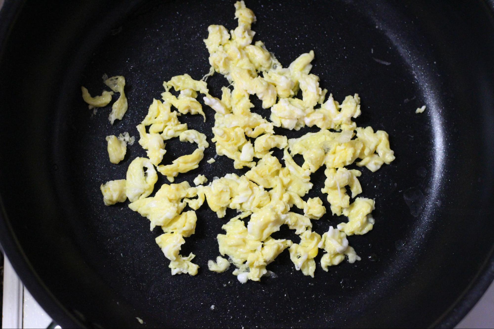 卵を溶きほぐし、フライパンで炒り卵を作る。できあがったら器に取り出す。