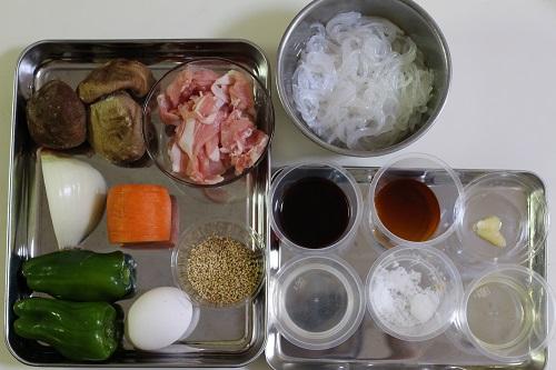 白滝は下茹でして、ザク切りにする。玉ねぎは薄くスライスし、にんじん、ピーマンは細切りにする。しいたけは石づきを切り落とし、細切りにする。野菜はなるべく細切りにすると全体がなじみやすくなる。