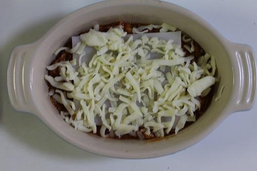 器に鯖ミートソース、スライス餅2枚の順にのせる。この作業をもう1回繰り返し、最後にチーズをのせる。200度に余熱したオーブンで約10~15分加熱する。オーブントースターの場合は約10分加熱する。加熱が終わったら完成だ。