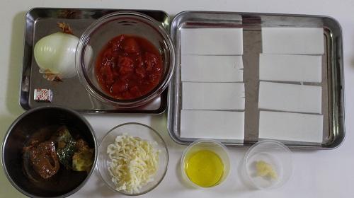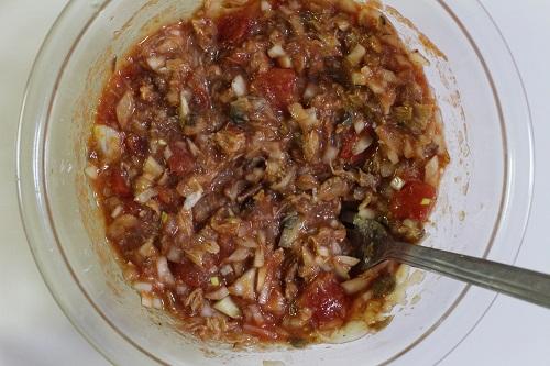 ほぐした鯖味噌煮缶に玉ねぎ、カットトマト缶、にんにくすりおろし、固形コンソメ、オリーブオイルを加えて全体をよく混ぜる。全体が混ざったら、ラップをかけて600Wの電子レンジで約7分加熱する。加熱が終わったら、軽く全体を混ぜ合わせる。
