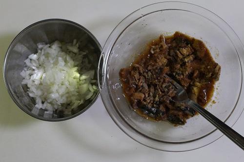 玉ねぎは細かくみじん切りにする。鯖味噌煮缶はボウルに移し、フォークで細かくほぐす。
