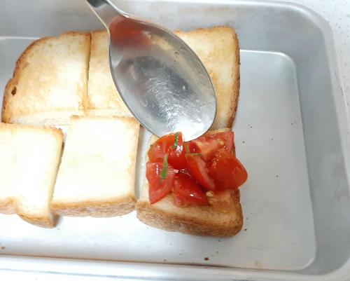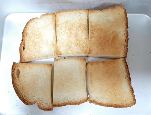 食パンを6等分にカットして、トースターに入れ、3分程度焼く。