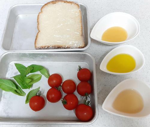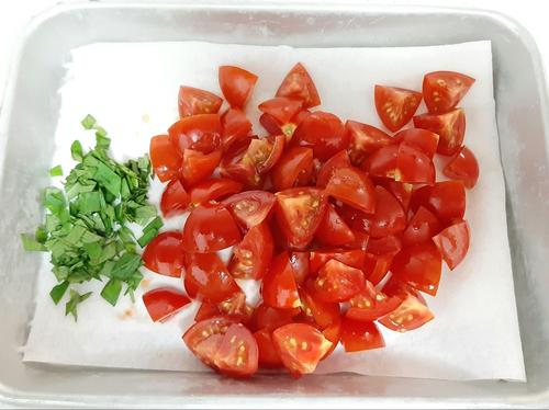 プチトマトはヘタを取って洗い、8等分にカットする。バジルは軽く濡らしたキッチンペーパーで拭き、粗みじん切りにする。