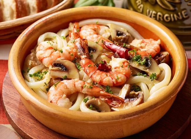 アヒージョとはバケットなどを浸して食べるのが一般的だが、モチモチとしたコシのある「さぬきうどん」にもよく合い、凝縮された旨みは絶品である。うどんにオイルをしっかりと絡めたら、余分なオイルが落ちるのを待って、えび、たこ、カキ、いかなどの具材と一緒に召し上がってもらいたい。残ったオイルは定番のバケットのほか、ごはんを合わせても良いだろう。