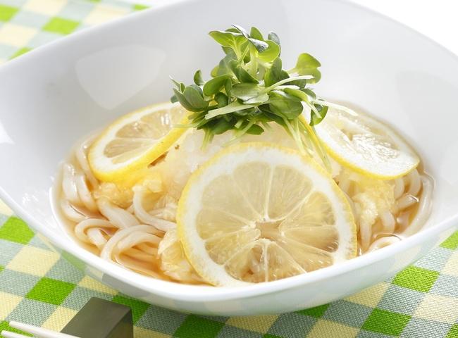 器にうどんを盛り付け、大根おろしとみじん切りしたレモンをのせ、つゆをかけてから、レモンスライスと貝割れ菜を飾れば完成だ。