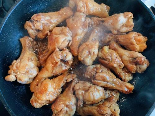 鶏手羽元にしっかりと火が通り、両面に焦げ目がつき、調味料が絡んだら完成となる。